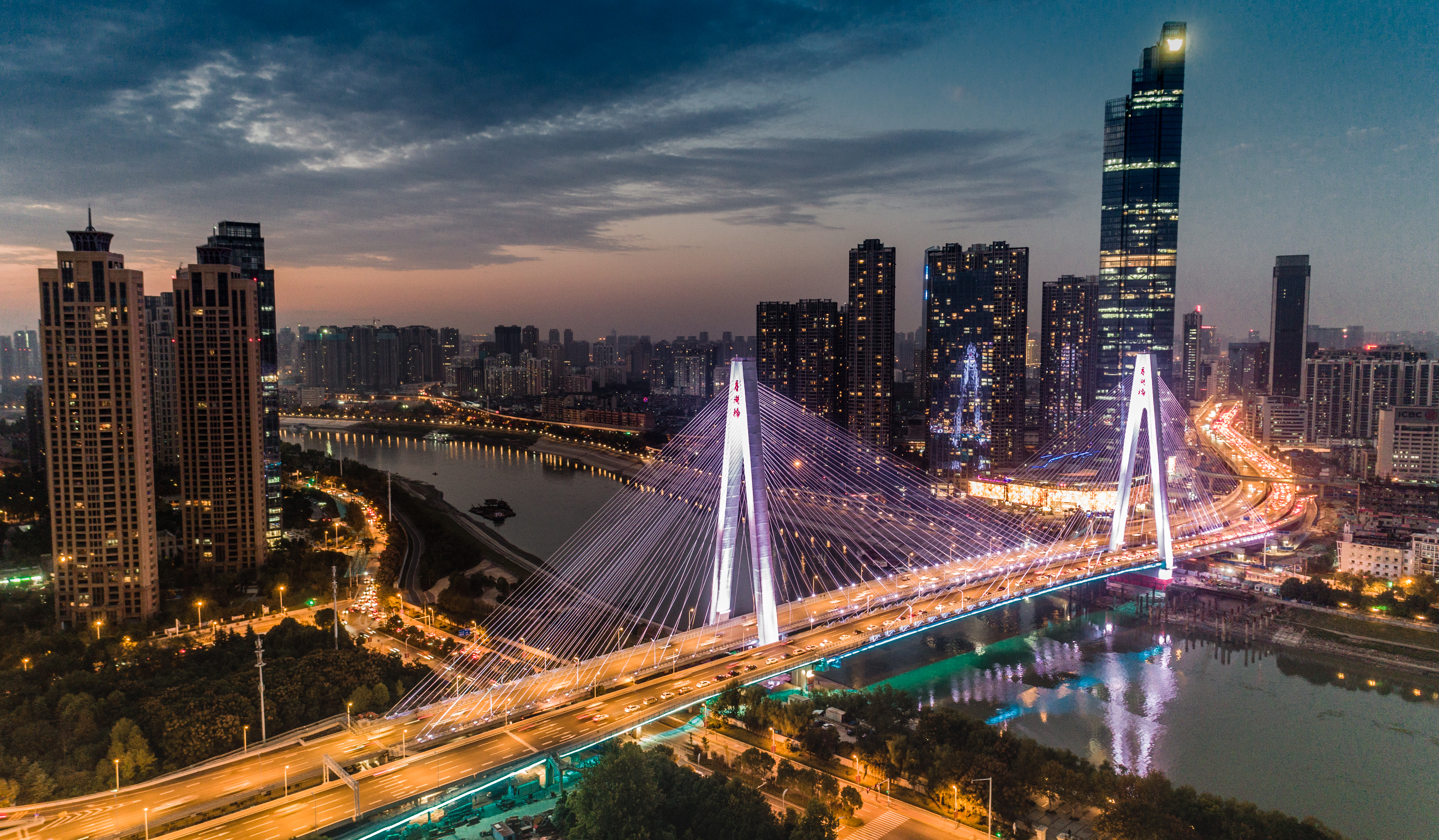 江漢四橋工程南起漢陽梅子山通道,北至漢口京漢大道,全長約1.86KM,主線按城市快速路標(biāo)準(zhǔn)建設(shè),設(shè)計(jì)時(shí)速60KM∕h、設(shè)雙向6車道,地面輔道按城市次干路標(biāo)準(zhǔn)建設(shè),設(shè)計(jì)時(shí)速40KM∕h、設(shè)雙向4-6車道。工程內(nèi)容主要包括:拓寬既有梅子山通道、新建江城大道下穿琴臺(tái)大道地下通道、在既有月湖橋下游新建一幅跨江大橋及兩岸引橋、新建琴臺(tái)大道上跨江城大道高架橋,以及相配套的人行天橋、通道、道路排水、交通、綠化、照明等工程。項(xiàng)目于2018年8月31日建成通車。