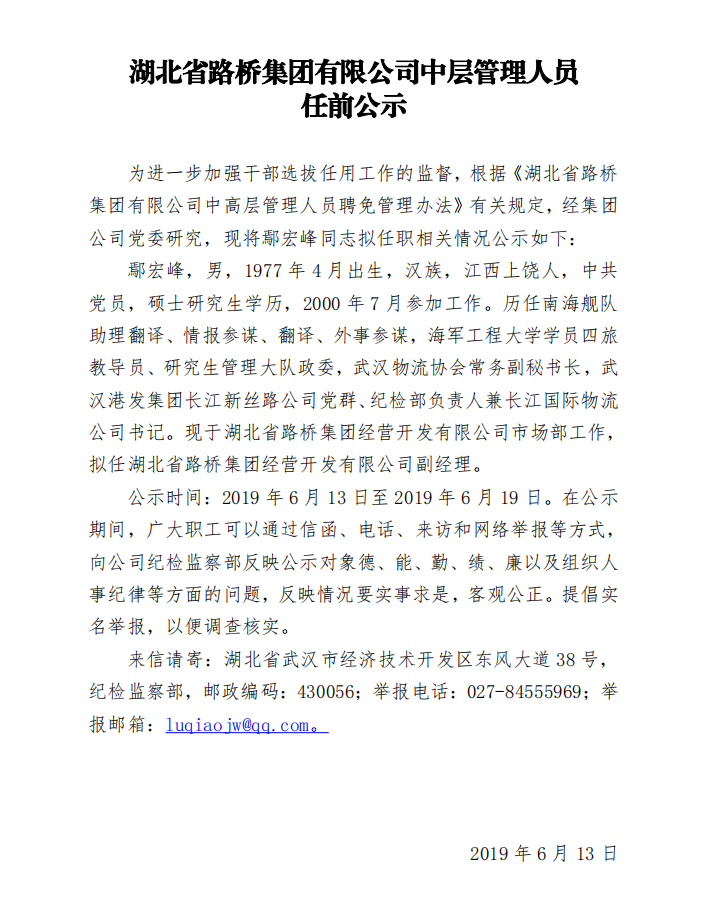 湖北省路橋集團有限公司中層管理人員任前公示