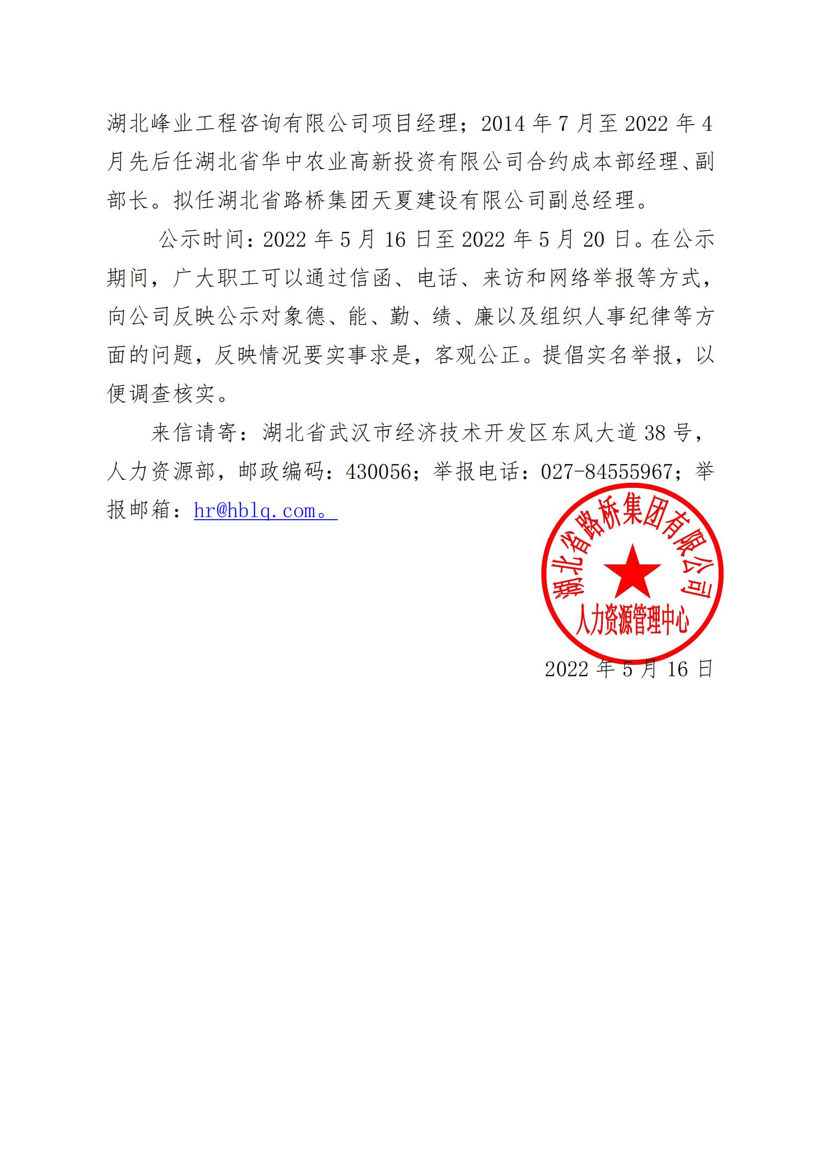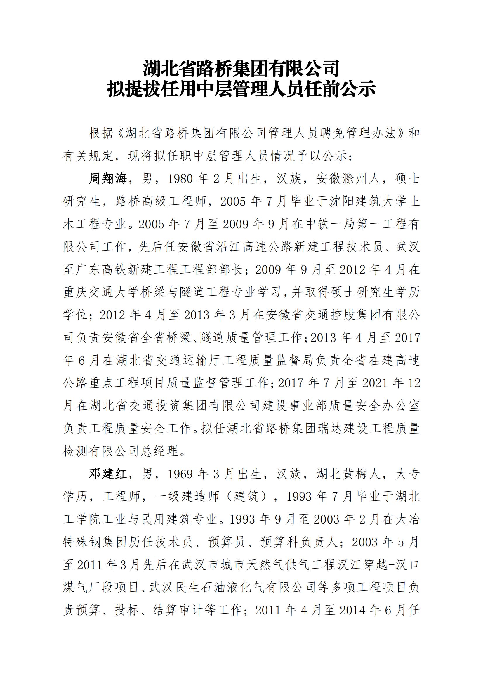 湖北省路橋集團有限公司擬提拔任用中層管理人員任前公示
