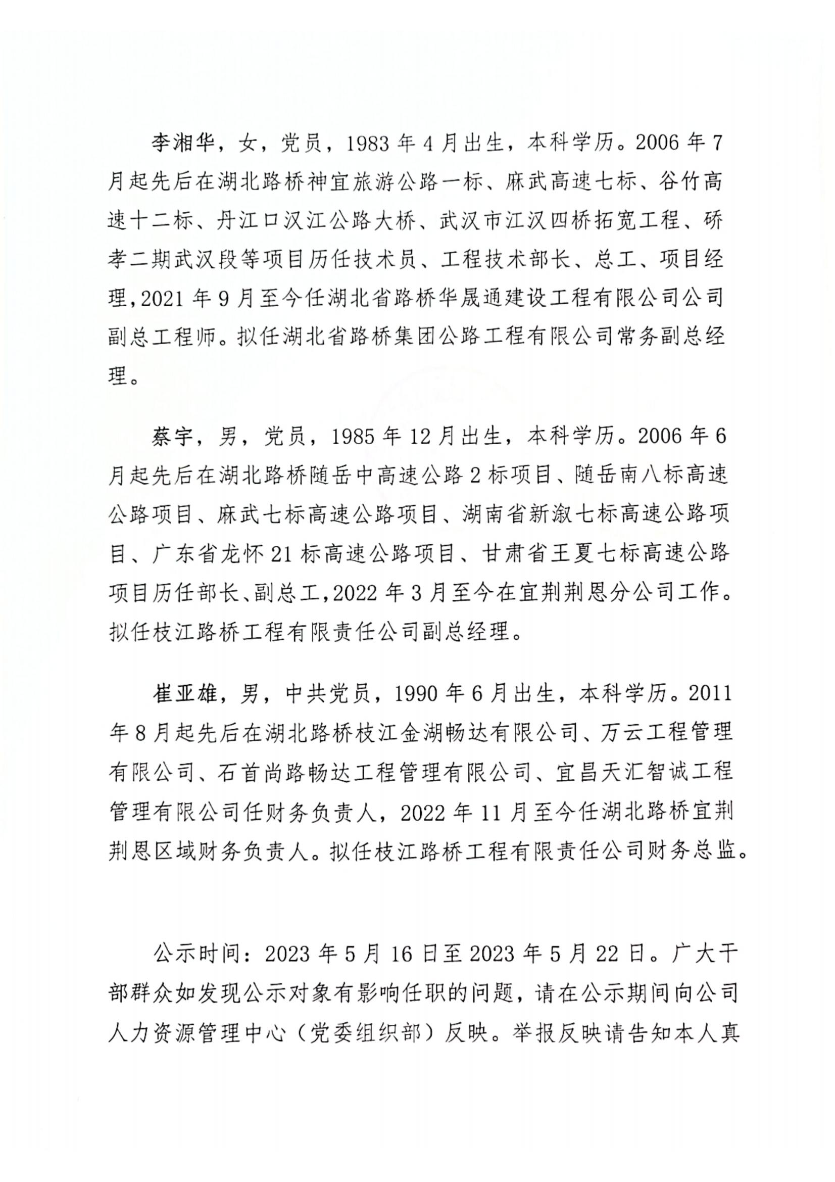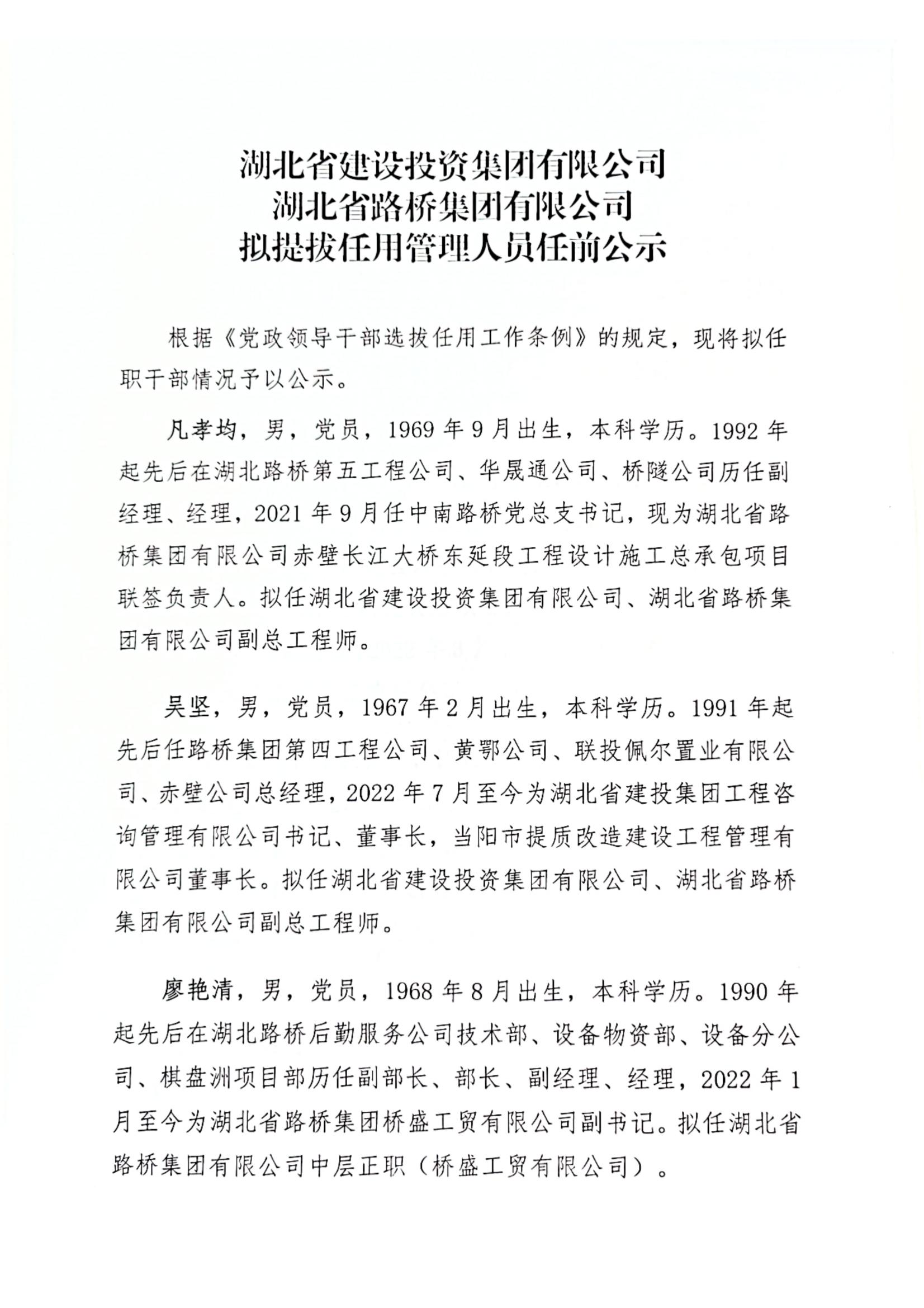 湖北省路橋集團有限公司擬提拔任用管理人員任前公示