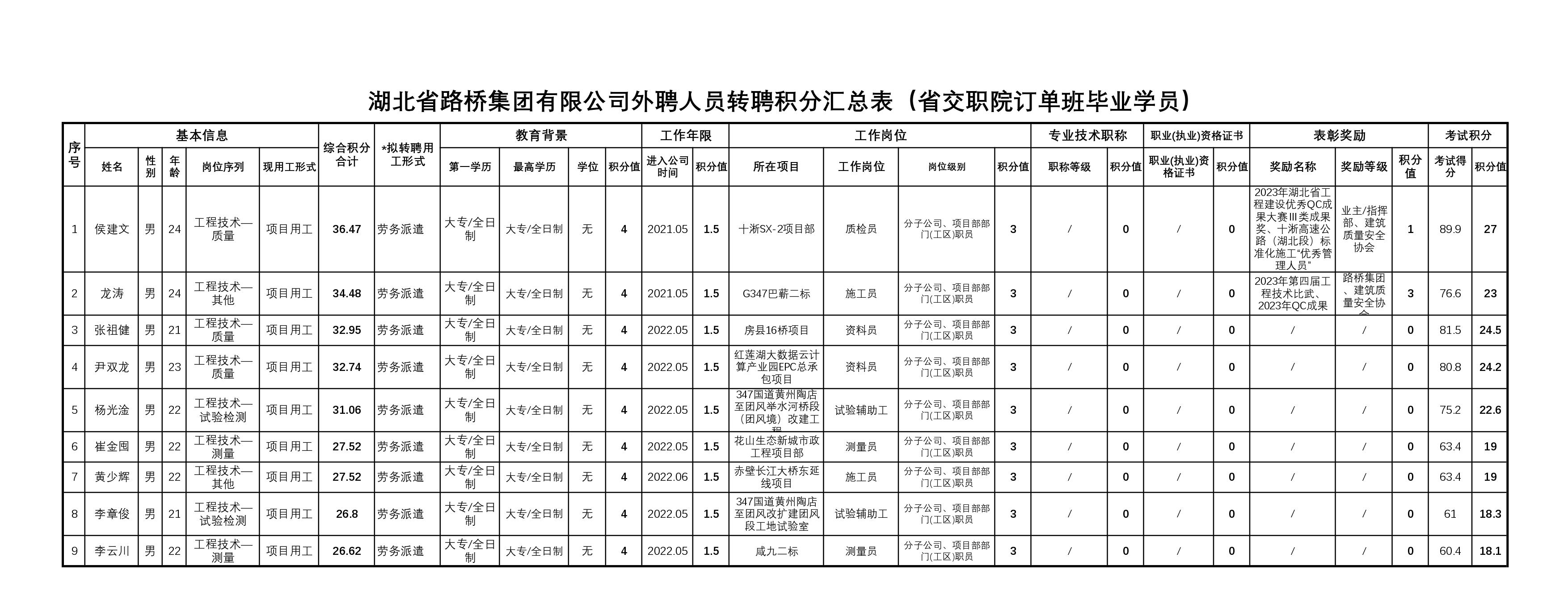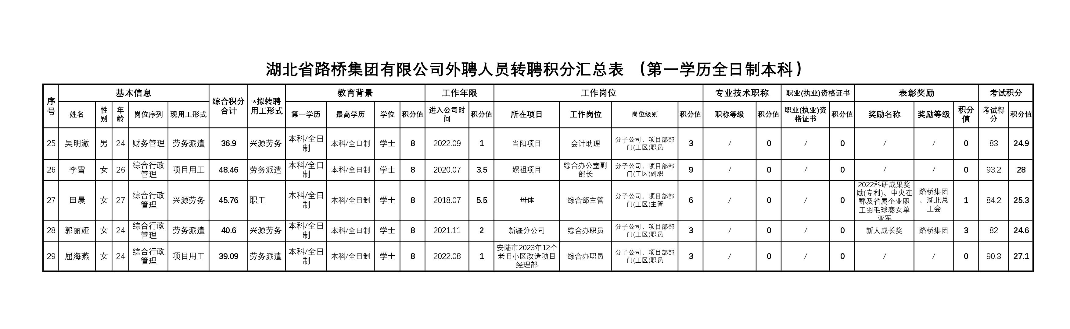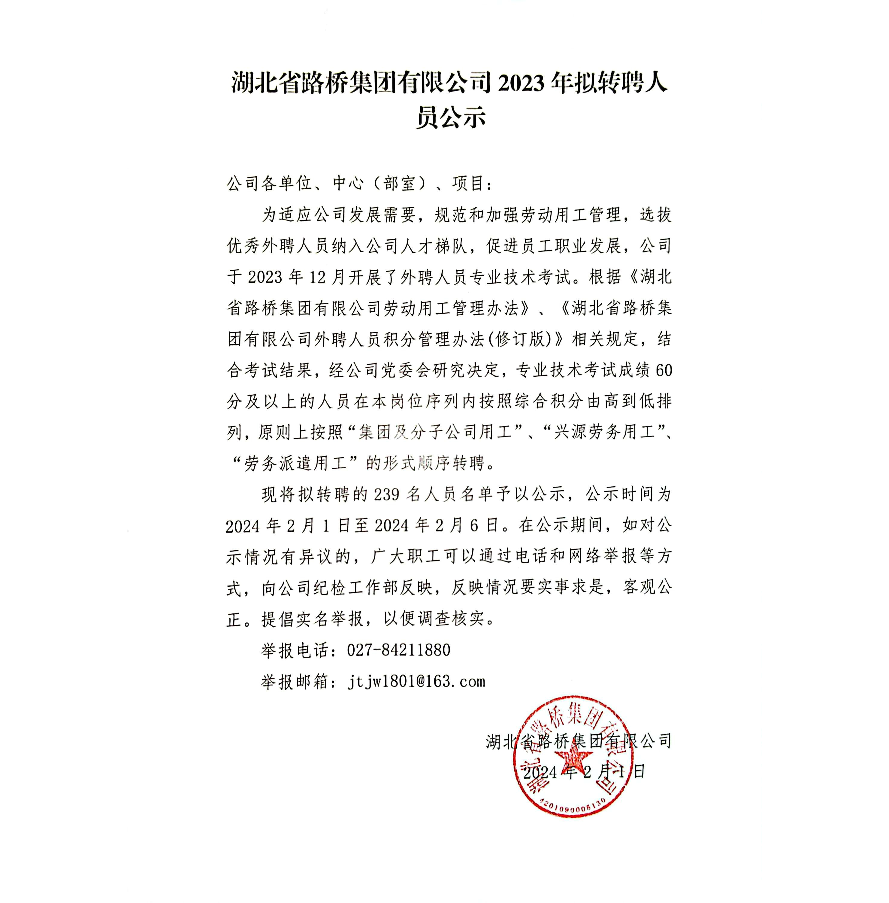 湖北省路橋集團有限公司2023年度擬轉聘人員補充公示