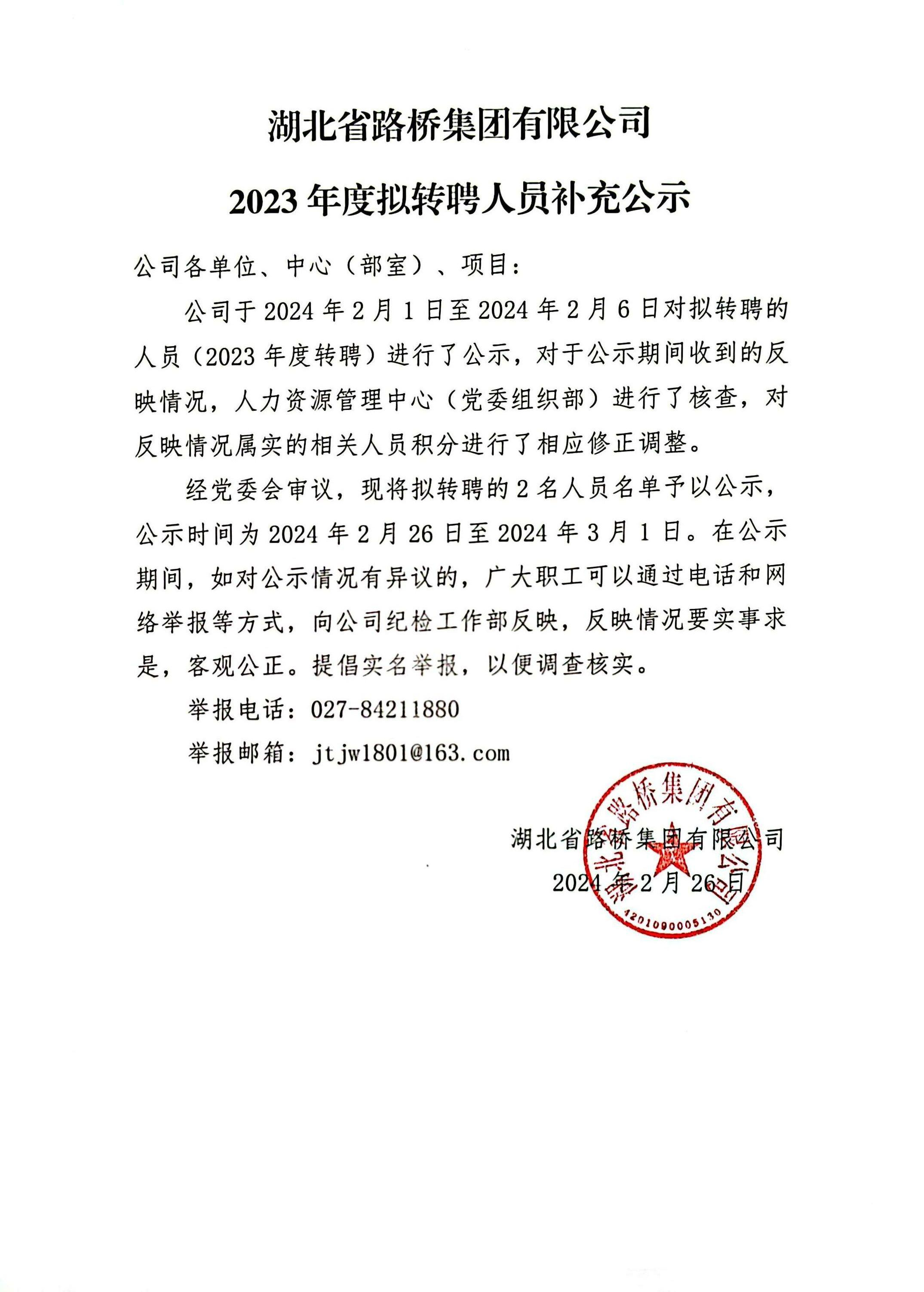 湖北省路橋集團有限公司2023年度擬轉聘人員補充公示
