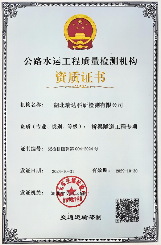 經(jīng)湖北省交通運(yùn)輸廳批準(zhǔn),湖北路橋瑞達(dá)科研檢測(cè)公司成功取得公路工程橋梁隧道工程專(zhuān)項(xiàng)資質(zhì),成為全省第5家取得該資質(zhì)的檢測(cè)機(jī)構(gòu),資質(zhì)實(shí)力達(dá)到了新高度。