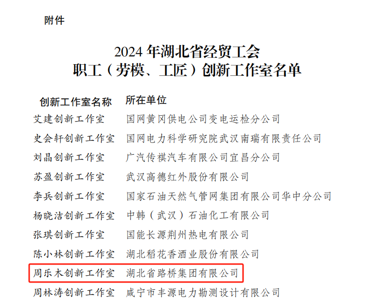 近日,湖北省經(jīng)貿(mào)工會印發(fā)了《關(guān)于 2024年湖北省經(jīng)貿(mào)工會職工(勞模、工匠)創(chuàng)新工作室建設(shè)結(jié)果的通報》,湖北路橋“周樂木創(chuàng)新工作室”獲評“湖北省經(jīng)貿(mào)工會職工創(chuàng)新工作室”。