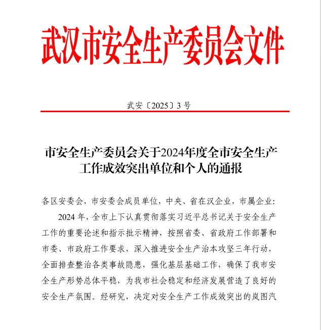 近日,武漢市安全生產(chǎn)委員會發(fā)布《關于2024年度全市安全生產(chǎn)工作成效突出單位和個人的通報》,華晟通公司榮獲武漢市2024年度安全生產(chǎn)工作“優(yōu)秀集體”稱號,黨總支書記、董事長凡孝均獲評武漢市2024年度安全生產(chǎn)工作“優(yōu)秀個人”榮譽。
