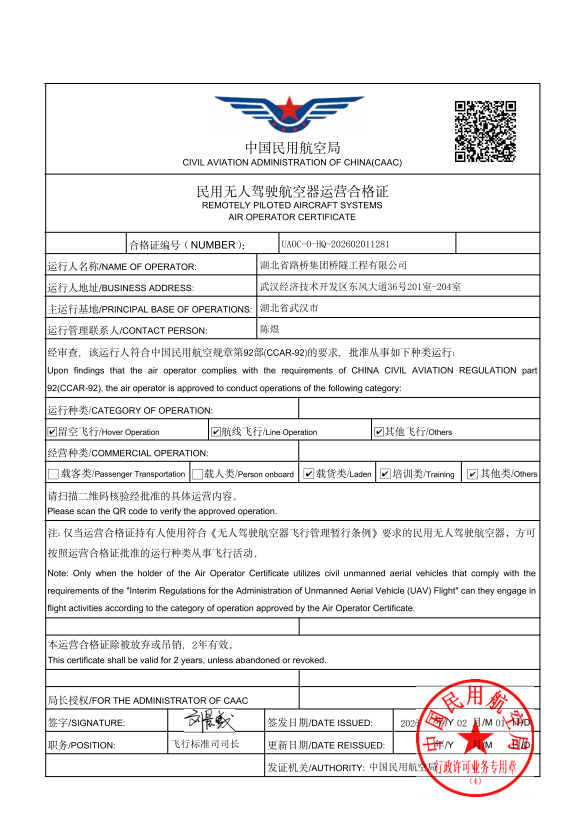 近日,橋隧公司測(cè)量監(jiān)測(cè)服務(wù)中心成功取得測(cè)繪乙級(jí)資質(zhì)(涵蓋工程測(cè)量、界線與不動(dòng)產(chǎn)測(cè)繪、攝影測(cè)量與遙感專業(yè))和民用無(wú)人駕駛航空器運(yùn)營(yíng)合格證,為橋隧公司進(jìn)一步完善業(yè)務(wù)布局、提升綜合服務(wù)能力、拓寬市場(chǎng)領(lǐng)域注入新動(dòng)能。