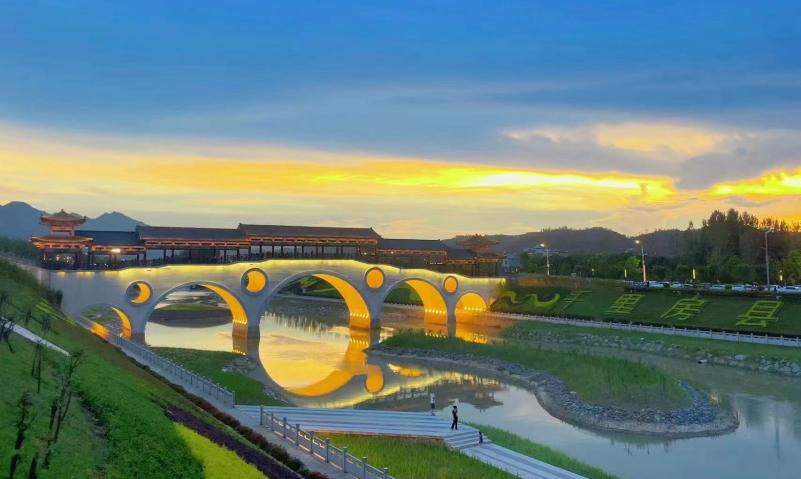 西河拱橋位于老西河拱橋北面,全長106m,采用27+37+27m上承式鋼筋混凝土拱橋結(jié)構(gòu),橋拱采用古風古韻的風雨廊橋造型,與房縣《詩經(jīng)》文化遙相呼應。