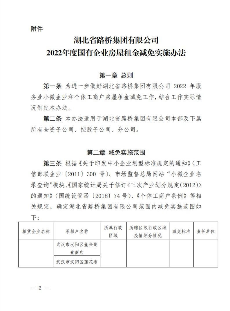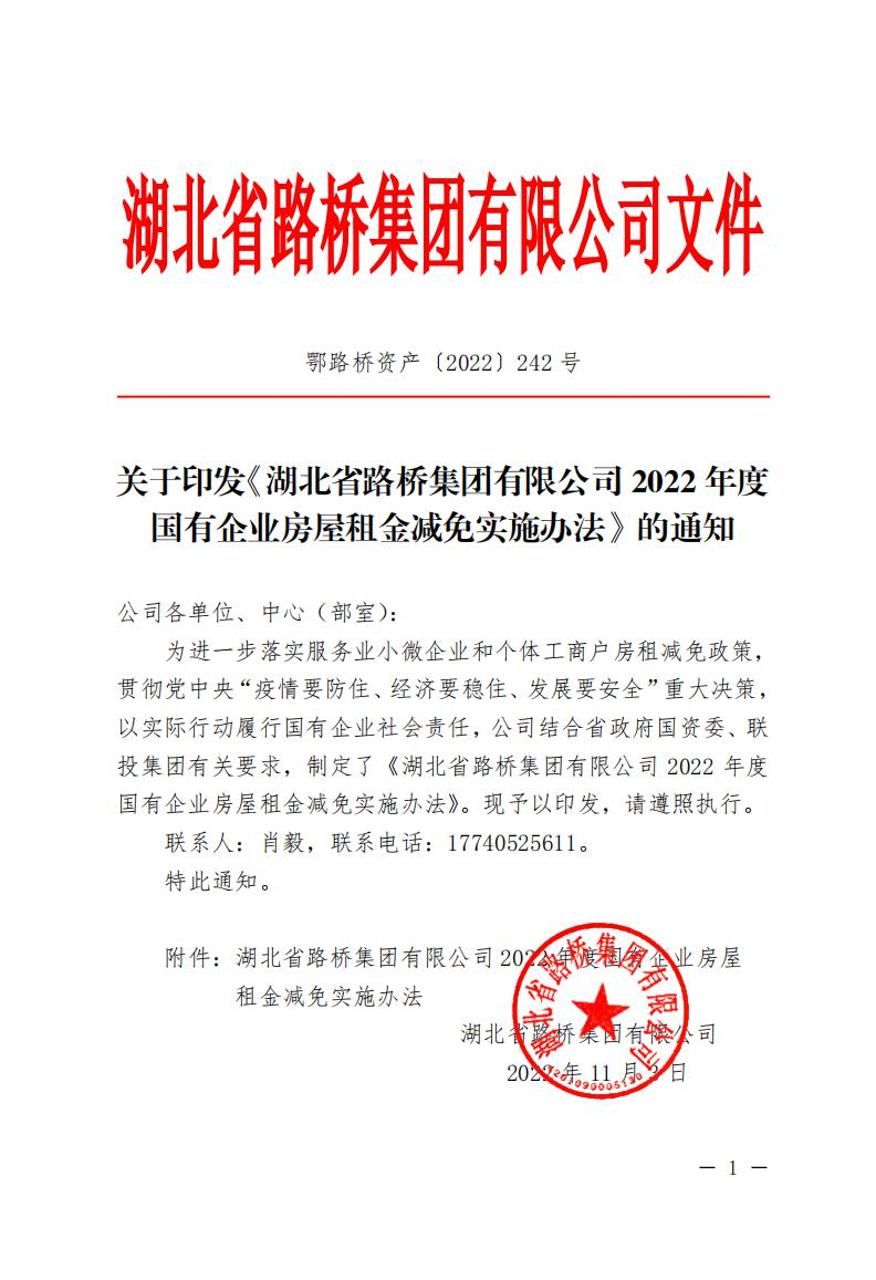 關(guān)于印發(fā)《湖北省路橋集團(tuán)有限公司2022年度國有企業(yè)房屋租金減免實(shí)施辦法》的通知